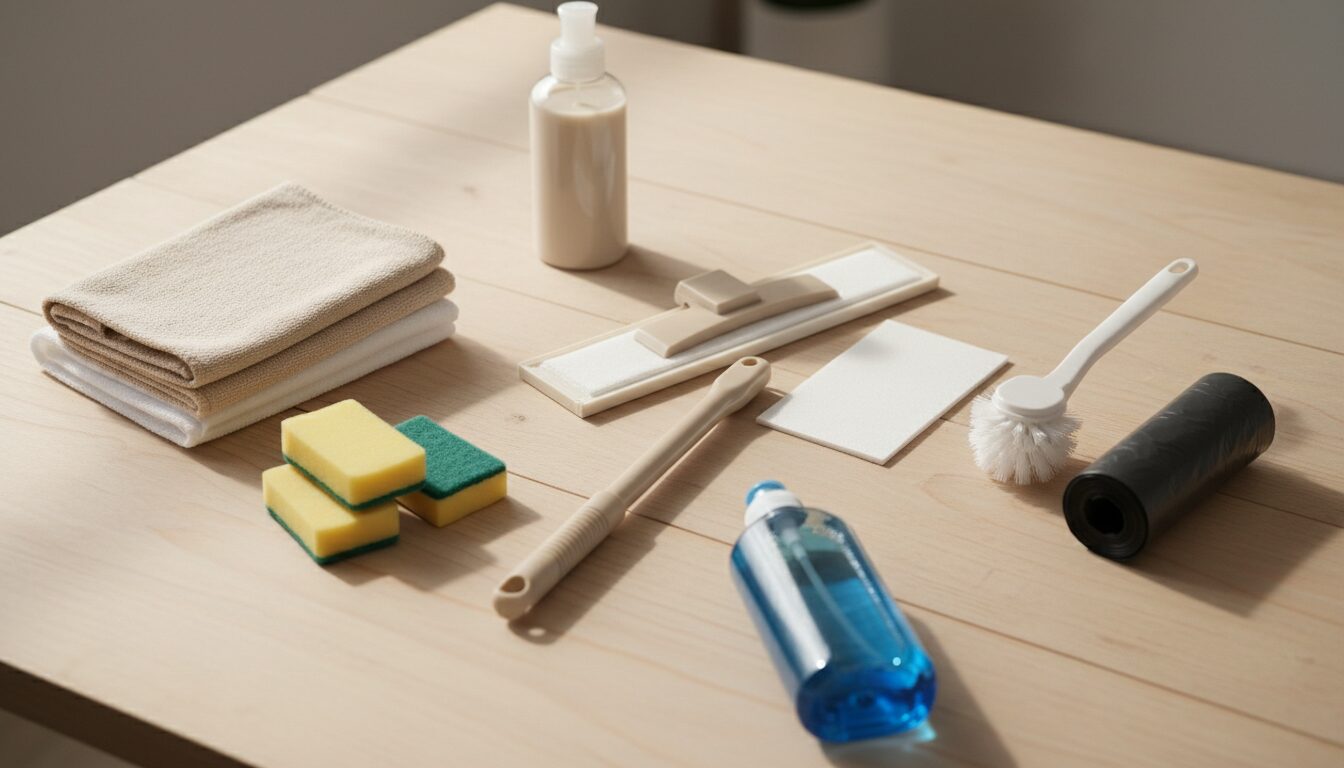 フローリングワイパー、雑巾、スポンジ、トイレブラシ、ゴミ袋、中性洗剤、浴室用洗剤。これだけあれば、ひとり暮らしの部屋は清潔に保てます。